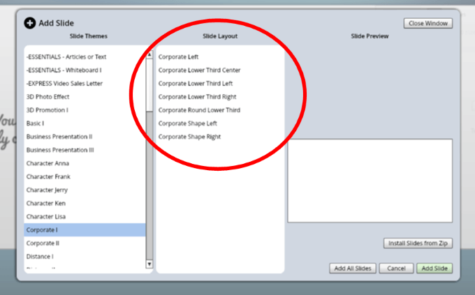 After you click Add Slide, you will see the options shown in the screenshot below.