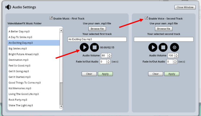 Note that there are separate setting options with the same controls for a music file and a voiceover file.