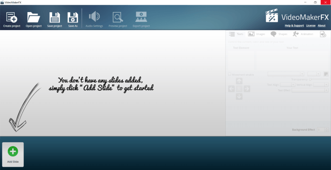 After you create your project, the screen shows you that you don’t have any slides added. Simply click Add Slide to get started.