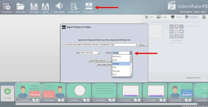 It’s now time to render or export your video. Select Export project from the top bar navigation. Browse to select the directory and filename of your exported video file.