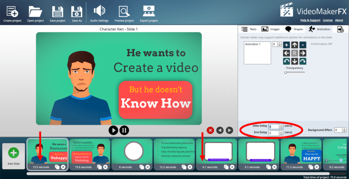 Each slide comes with a standard amount of time allotted to it. You can also delay the slide or end the delay, which will add time before the side begins or make it last longer (see circled area below).