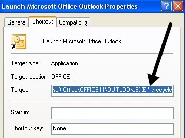 “C:Program FilesMicrosoft OfficeOFFICE11OUTLOOK.EXE” /recycle