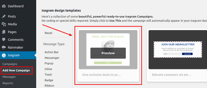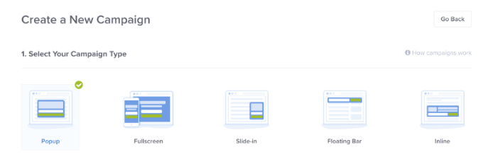 - From the Campaign Type, select Popup. The next screen will show you several professionally designed templates in various colors and layouts.