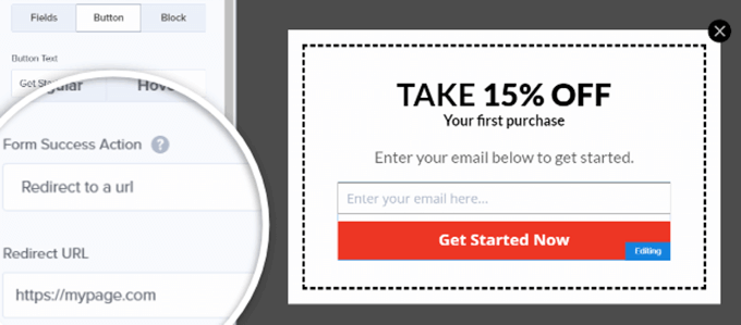 Note that the Success view is the default button action. If you want to use a different option, change the button action by following the steps below: