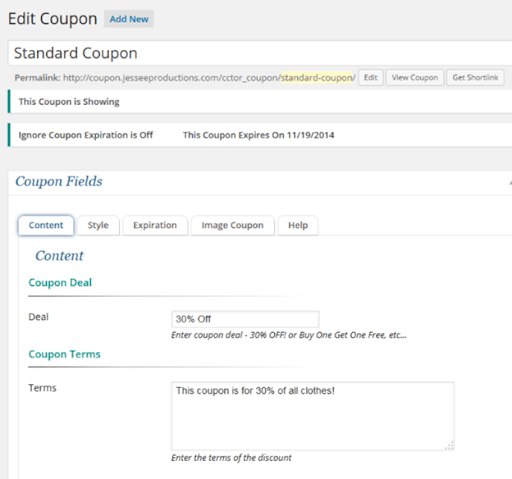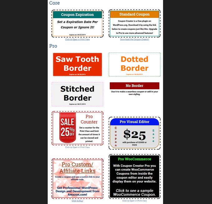 Coupon Creator uses a custom post type and only requires configuring a few settings.The free version enables users to display and print coupons for customers.