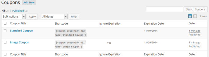- To use the coupon, insert the shortcode on any page or post where you want it to show. If you assign an expiration date, the coupon will no longer be visible beyond the expiration date you set.