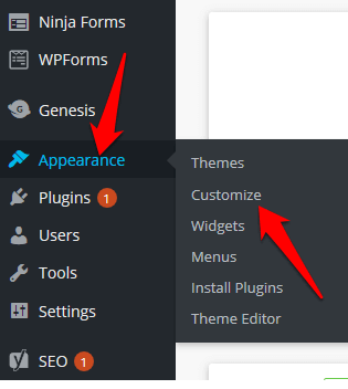 You can access the Theme Customizer by going to the **Appearance **settings on your dashboard and selecting Customize. Alternatively, go to the admin bar and click on the **Customize **link.