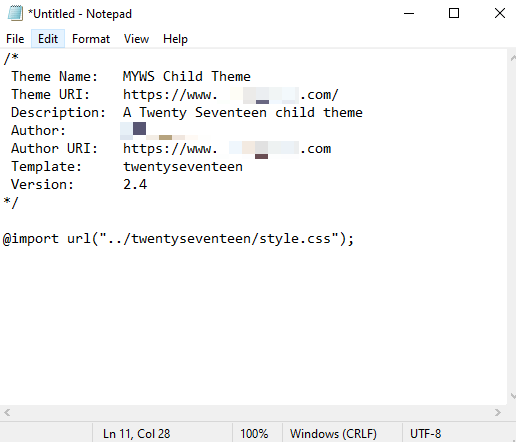 - Open Notepad or other text editor and paste the code as shown below to create a stylesheet, and then save the file in the child theme folder you created. The Template: twentyseventeen tells WordPress that it’s a child theme of your current theme, while the last line in the code will import the main theme’s stylesheet into the child theme.