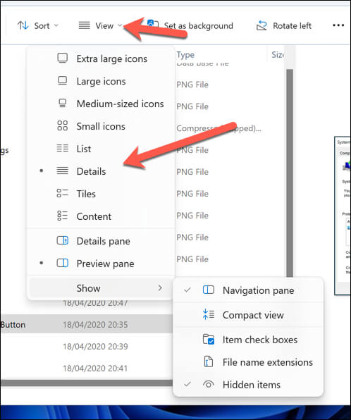 - Experiment with the available options, such as Extra large icons or Details. You can also apply other settings, such as the ability to view hidden folders.