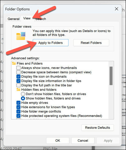 - In the Folder Options menu, select the View tab. * Press Apply to Folders. This will set your current folder’s view as the default for all folders with the same template.