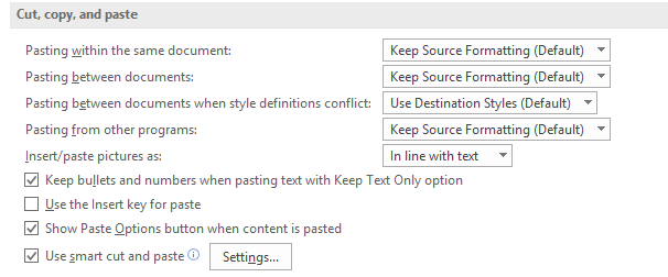 Clicking on it brings up a window for setting the defaults for a myriad of Word options: We only need to look at the defaults for Cut, copy and paste: