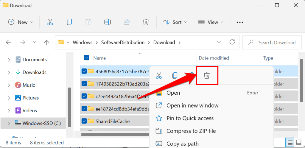 - Press Ctrl + A to select all folders. Right-click the selection and select the Trash icon—or press the Delete key on your keyboard.