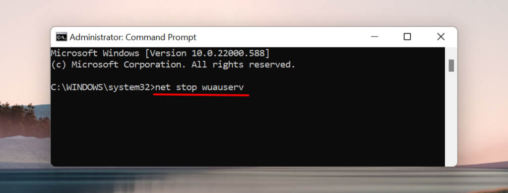 - Type or paste **net stop wuauserv** in the terminal and press **Enter** on the keyboard.