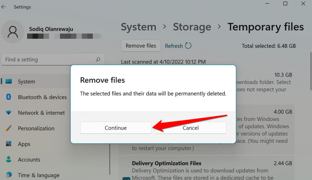 - Select Continue on the confirmation to delete the Windows Update Files.