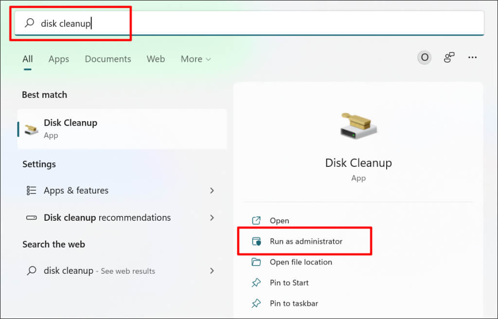- Press the Start button, type disk cleanup in the search bar, and select Run as administrator below Disk Cleanup.