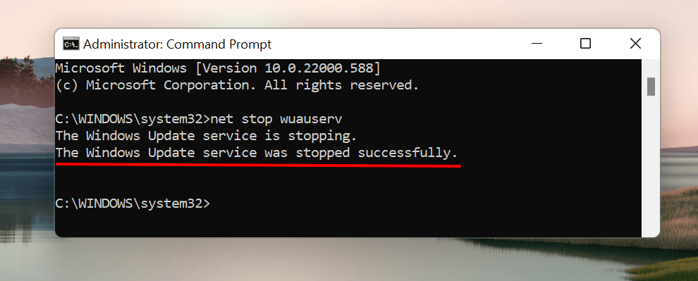 This command instructs Windows to stop the Windows Update service. Proceed to the next step when Command Prompt displays a “The WIndows Updater service was stopped successfully” message.