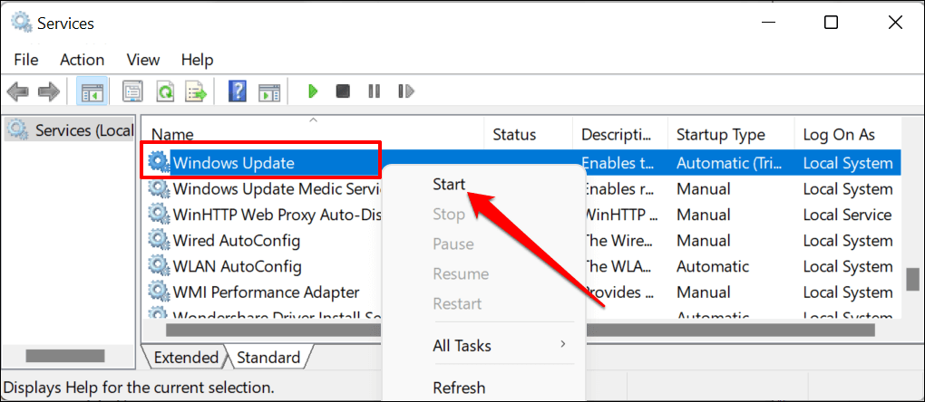 - Reopen the Windows Services app (see step #1), right-click Windows Update, and select Start.