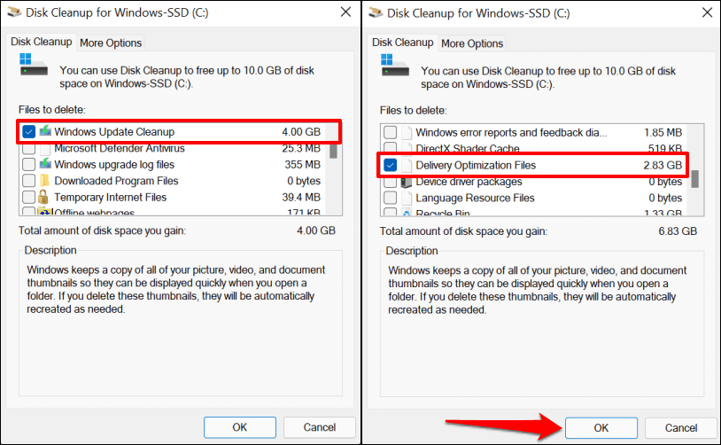 - Select the **Windows Update Cleanup** and **Delivery Optimization Files** checkboxes and select **OK**.