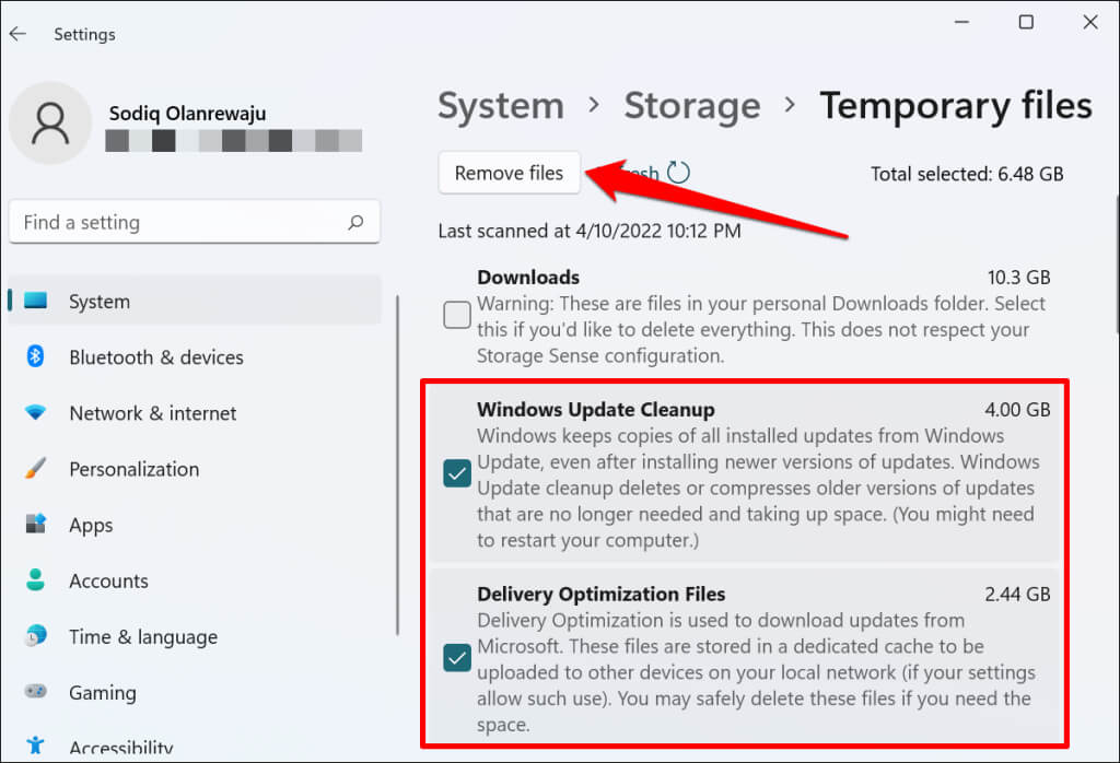 - Select the **Windows Update Cleanup** and **Delivery Optimization Files** checkboxes. Afterward, select the **Remove files** button at the top of the page.