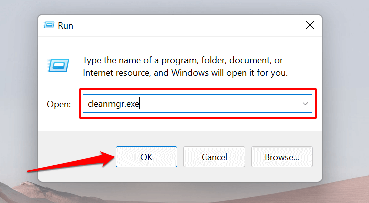Alternatively, open the Windows Run box (press Windows key + R), type or paste cleanmgr.exe in the dialog box, and select OK.