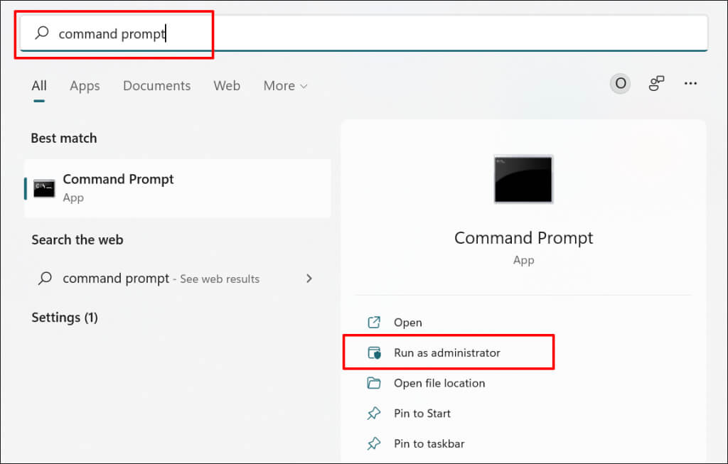 - Type command prompt or cmd in the Windows Search bar and select Run as administrator.
