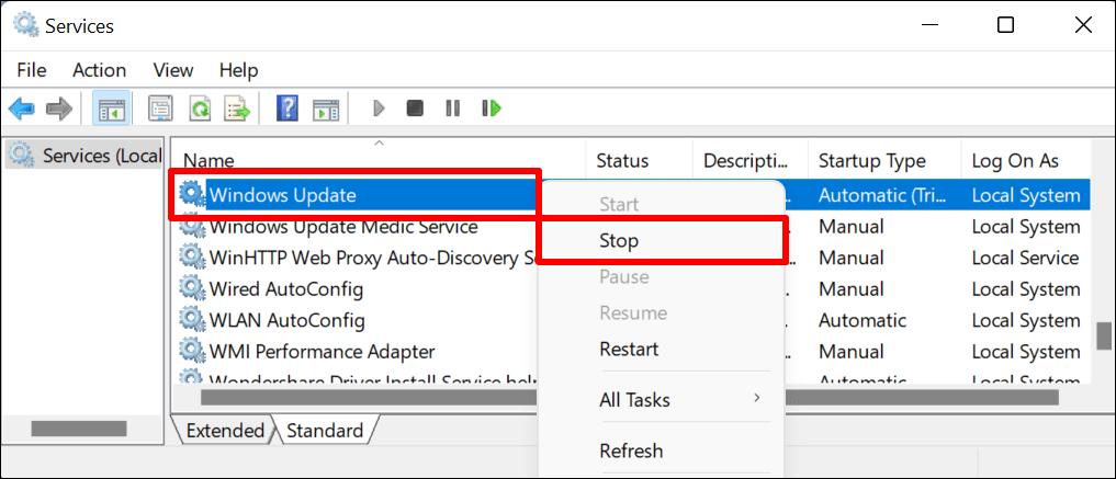 - Right-click on **Windows Update** on the list of services and select **Stop**.
