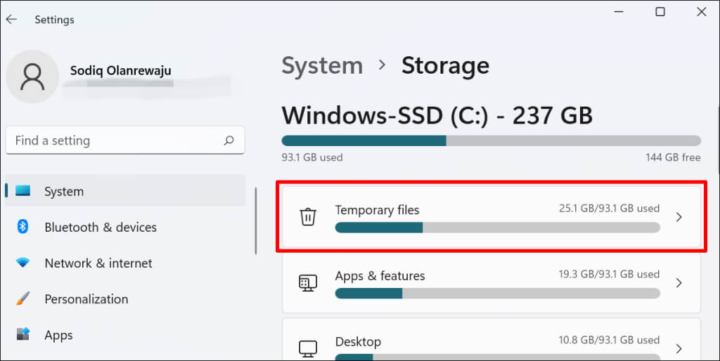 - In Windows 11, go to Settings > System > Storage and select Temporary files.