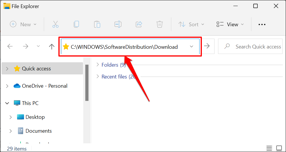 - Open the File Explorer (press **Windows key** + **E**), paste **C:WINDOWSSoftwareDistributionDownload** in the Navigation Pane, and press **Enter**.