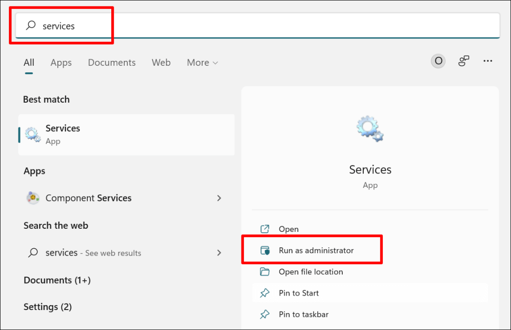 - Open the Windows Start Menu, type services in the search bar, and select Run as administrator below the Services app.