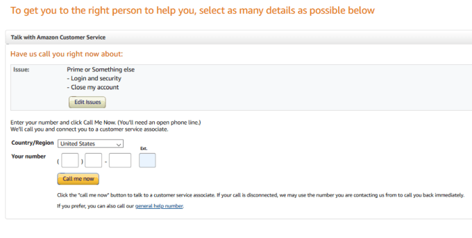 - If you select the **Phone **option, enter your phone number in the new page. Wait for an Amazon customer representative to call you with the instructions.