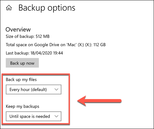 - In the **Backup options** menu, you can change how often file backups are made and how often they’re saved before being deleted. Change these under the **Back up my files** and **Keep my backups** drop-down menus. By default, the **Keep my backups** option is set to **Forever**—changing this to delete backups every month, or when space is needed, will increase your available disk space.
