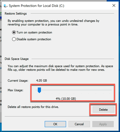 - In the **System Protection** window, press the **Delete** button. This will remove any saved System Restore points. You can also change how much disk space this feature uses by moving the **Max Usage** slider.