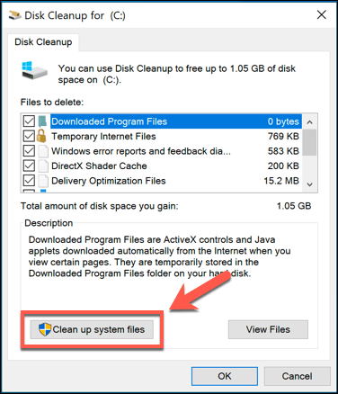 - In the **Disk Cleanup** window, press the **Clean up system files** option to view options to clear system files.