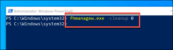 - In the PowerShell window that appears, type **fhmanagew.exe -cleanup 0** to remove all but the most recent file backups, then hit enter to run the command. You can replace **0** with another set of days to leave a longer period of backups saved. If the command is successful, a pop-up window will appear to confirm.