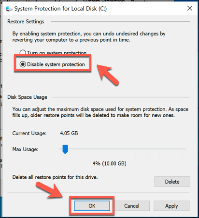 - While it isn’t recommended, you can also disable this feature and restore all of the **System Protection** reserved space for general usage by pressing the **Disable system protection** radio button. Press **OK** to save your settings once you’re done.