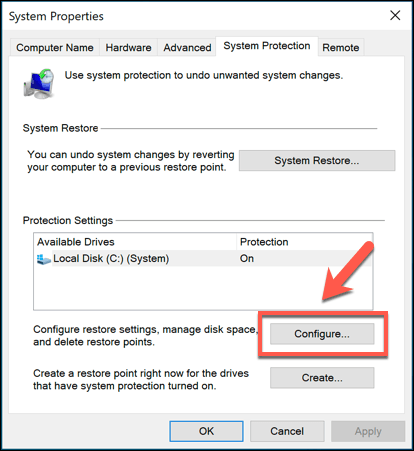 - This will open the **System Properties** window. In the **System Protection** tab, press the **Configure** button.