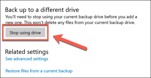 - You can also disable Windows File History entirely by pressing the **Stop using this drive** option in the **Backup options **menu. This will remove your current Windows file backup drive, therefore disabling the feature entirely.