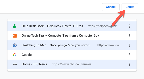 - Once you’ve selected the bookmarks, select the **Delete** button in the top menu. Alternatively, select the **three-dots menu icon** next to one of the selected bookmarks (or right-click one of the selected bookmarks), then select **Delete** from the menu.