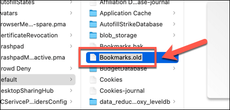 - In the **Default **folder, find the **Bookmarks** file. If you want to remove it, right-click and select **Rename**, then choose a new filename (eg. **Bookmarks.old**).