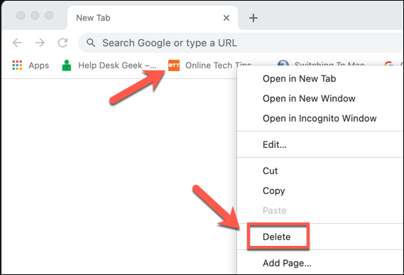 - With the bookmarks bar visible, right-click one of the visible bookmarks in your bookmarks bar. From the menu, select the **Delete** button.