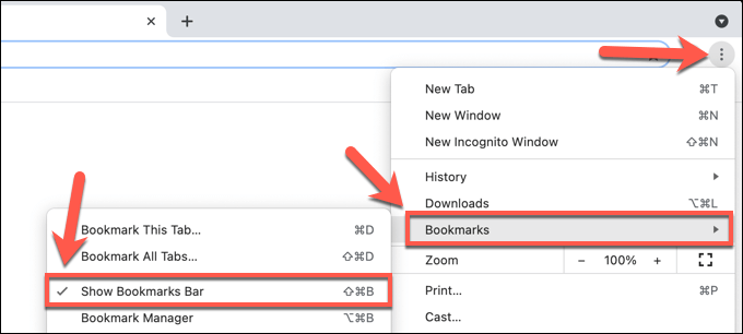 - To delete individual bookmarks from the Chrome bookmarks bar, make sure the bookmarks bar itself is visible. If it isn’t, enable it by selecting the three-dots menu icon in the top right, then selecting **Bookmarks **> Show Bookmarks Bar.