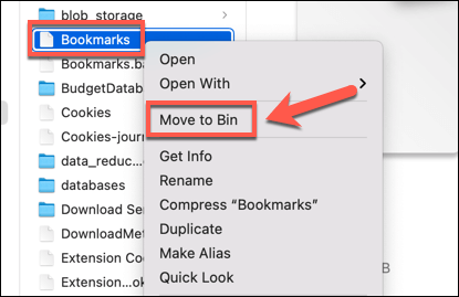 - To delete the **Bookmarks** file, right-click the file in Finder and select **Move to Trash **(or **Move to Bin**, depending on your locale).