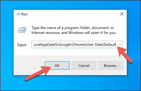 - In the **Run** dialog box, type **%LocalAppData%\Google\Chrome\User Data\Default **and select **OK**.