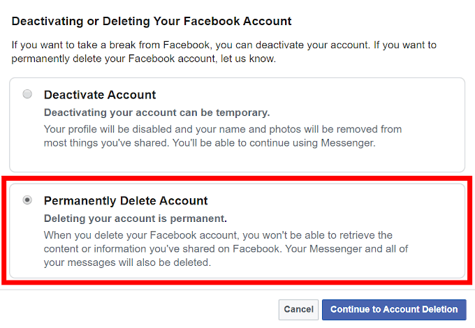 Remember that if you think there’s a chance you’ll want to reopen your Facebook account in the future, choose to deactivate instead of deleting it. Deactivate keeps all of your account information, photos, and settings intact while remaining invisible to friends and strangers alike. You can reactivate at any time.