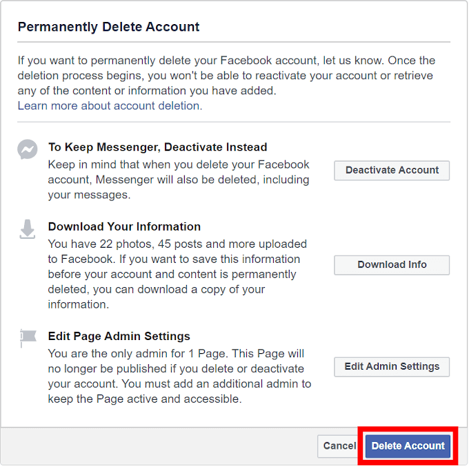 - Similar to pre-deletion of your Facebook Account, it may be a good idea to download a copy of your Page.