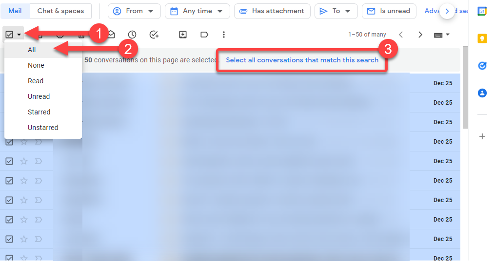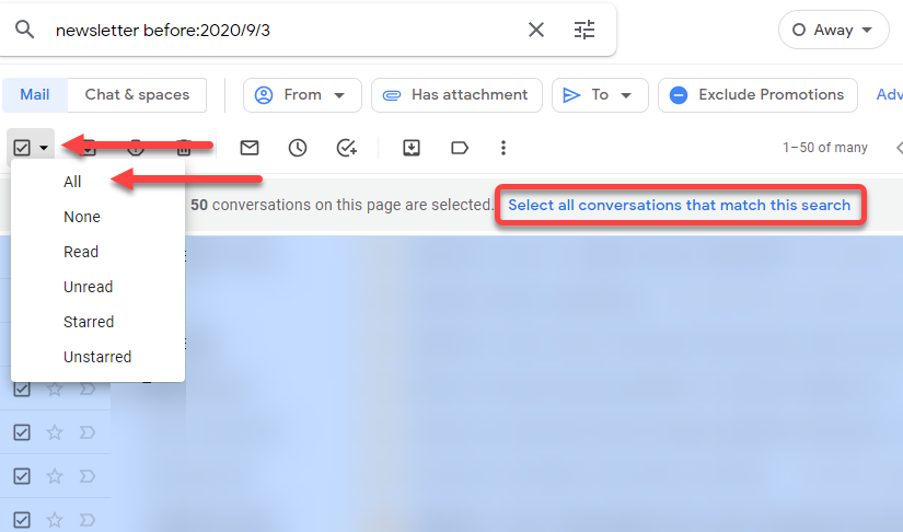 - Once you have the search results, select the small arrow beside the checkbox at the top-left and select All. However, be sure to check that no important emails have slid into the search results. Then, press the Delete button, and you’re done.