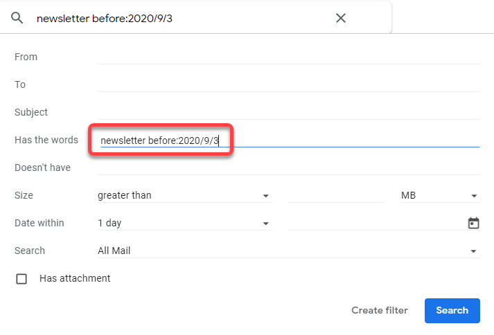 However, you also want to filter for the date such that the search query returns emails received one year ago or later. Unfortunately, there’s no option to create a filter that will give you all emails received one year ago or before. The only option you have is to select a time frame by inserting values in the Date within and the Date fields.