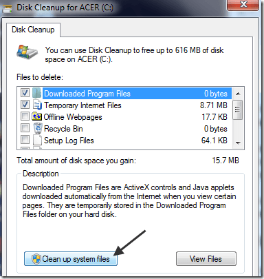 The system will perform a scan and another dialog will pop up with the selection. Now click on the button Cleanup system files button at the bottom.