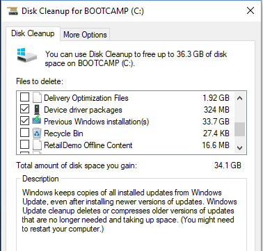 Click on the Disk Cleanup tab and look for a checkbox that says Previous Windows installations. Check it and click OK. Then click** Delete Files** when prompted.