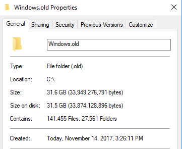 So, if your upgrade install failed 2 or 3 times, that Windows.old folder can become very large, very fast! On top of that, the folder is not automatically deleted once you are up and running with the newer version of Windows, so you have to get rid of it yourself.